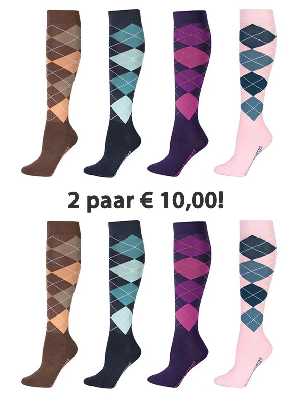 Comfortabele kniekous met een trendy ruit-motief. Het zachte voetbed zorgt voor extra comfort in uw rijlaarzen of rijschoenen. Vervaardigd van 15% katoen, 80% polyester en 5% elasthan. Machinewasbaar. Verkrijgbaar in diverse kleuren.