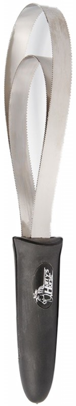 Buigzaam, metalen zweetmes met aan beide zijden kartels voor het verwijderen van zweet of water van de vacht. Door het eenvoudig in elkaar schuiven van de handgrepen kan het zweetmes zowel recht (tweehandig) als gebogen (eenhandig) worden gebruikt. De zachte, kunststof handgreep heeft een goede grip. De totaallengte is 58 cm. Verkrijgbaar in de kleur black.