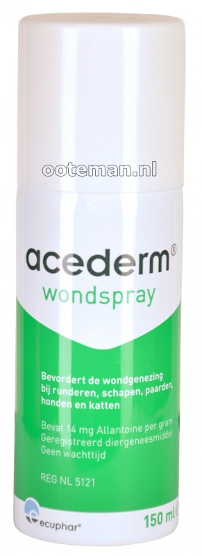 Acederm wondspray bevordert een mooie genezing van schaaf- en oppervlakkige wonden en afstoting van dood weefsel. Het bevordert de wondgenezing bij verwondingen, speen- en tepelaandoeningen, droge en vochtige mok, nabehandeling van operatieve wonden, verhoorning en wild vlees. Acederm wondspray bevat allantoïne, levertraan en perubalsem als werkzame stoffen. Door deze combinatie wordt de wond soepel gehouden en de bacteriële groei geremd. Ook bevordert Acederm de vorming van nieuw huidweefsel. Verkrijgbaar in spray van 150 ml.