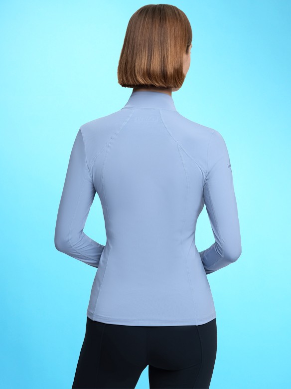 Trendy, elastisch shirt met korte ritssluiting en lange mouwen. De Base is vervaardigd van een zonbeschermende stof en biedt bescherming tegen ultraviolette straling. Het shirt is elastisch, vochtregulerend, ademend en comfortabel. Het shirt is voorzien van contrasterende stiksels. Vervaardigd van 82% nylon en 18% elasthan. Machinewasbaar. Verkrijgbaar in de kleur powder blue.