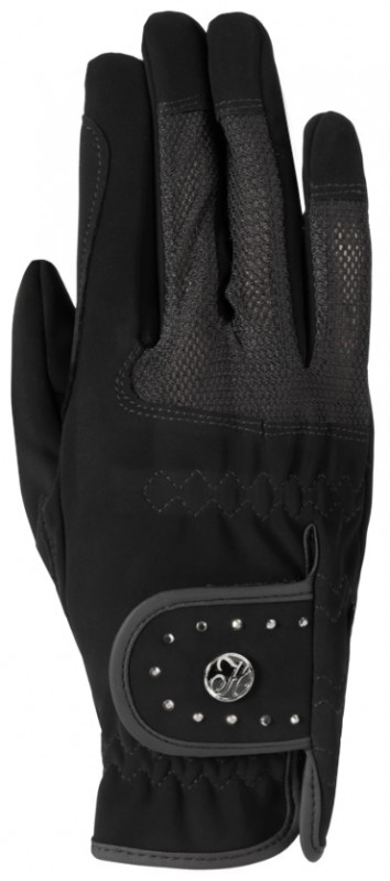 Fijne rijhandschoen van domy suède met een inzet van elastische mesh bij de vingers en een elastische inzet bij de pols. De handpalm is tevens vervaardigd van domy suède wat zorgt voor een optimale grip. Op de klittenbandsluiting bevinden zich glinsterende strass-steentjes en een Harry's Horse-logo. Machinewasbaar (30°C). Verkrijgbaar in de kleur black.