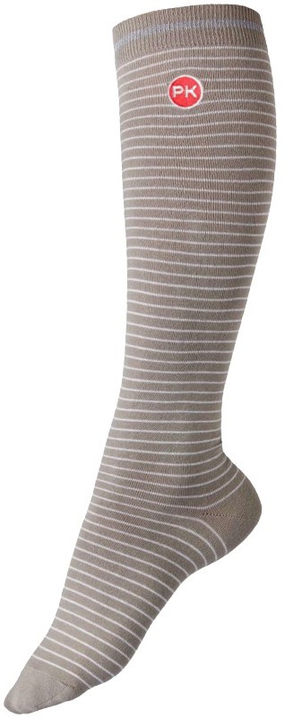 Mooie kwaliteit kniekous van sneldrogend materiaal met trendy streep-motief. Aan de bovenkant bevindt zich een fluo PK-logo. Vervaardigd van 68% katoen, 29% polyester en 3% spandex. Per paar verpakt. Machinewasbaar. Verkrijgbaar in de kleur feather.