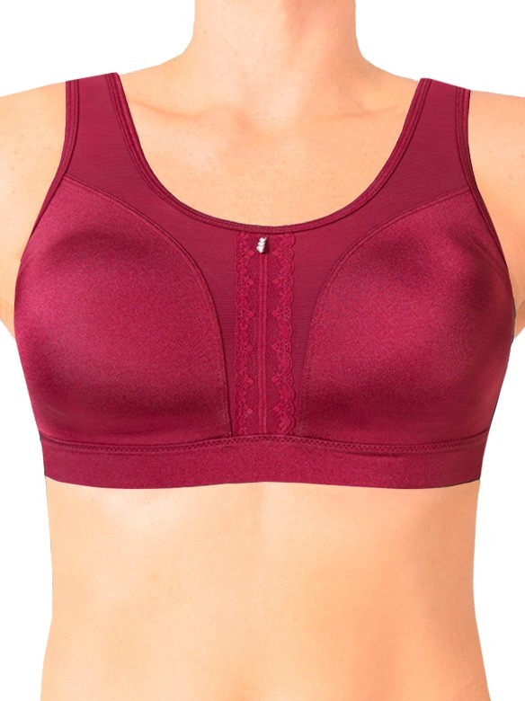 Comfortabele sport-bh met een extra goede ondersteuning tijdens beoefening van intensieve sporten als bijvoorbeeld paardrijden en hardlopen. De Cannes is voorgevormd en heeft geen beugel in de gevoerde en ademende cups. Rondom de cups bevinden zich geen naden, waardoor de Cannes ook geschikt is als postoperatieve sport-bh. De cups zijn zo gevormd dat de borst niet platgedrukt wordt, maar juist een mooi model behoudt. De brede en verstelbare schouderbandjes zijn gevoerd met zachte padding voor een optimale drukverdeling en blijven goed op de plaats tijdens het dragen. De band aan de onderkant voelt zacht aan en is verstelbaar. Door gebruik van licht glanzend en technisch materiaal heeft de Cannes als sport-bh een bijzonder stijlvolle uitstraling. Aan de voorkant in het midden heeft de Cannes een subtiele inzet van kant met een strass-hangertje voor extra elegantie. De kleur red is bewust gekozen, omdat deze kleur nauwelijks doorschijnt onder witte kleding. Vervaardigd van 80% polyamide en 20% elasthan. Machinewasbaar op 30 graden in het bijgeleverde waszakje. Verkrijgbaar in de kleur red.
