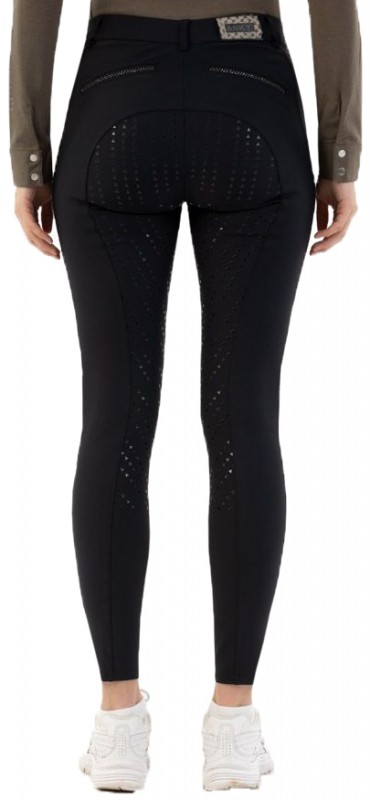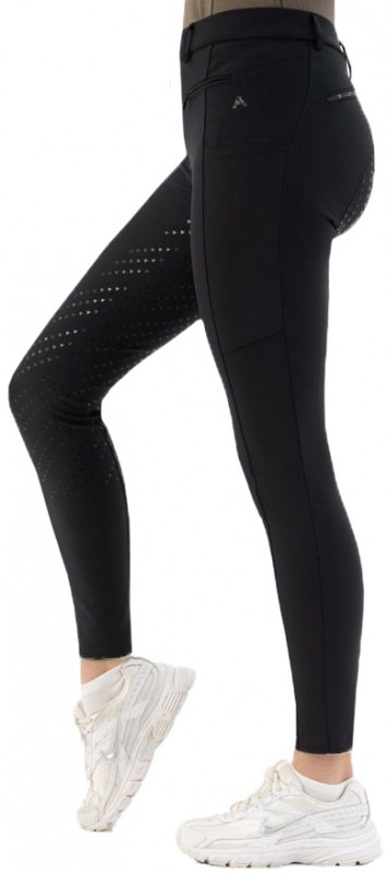 Trendy rijbroek met anti-slip zit, zakjes voor de smartphone en glinsterende details. De anti-slip zit is flexibel en zorgt voor extra grip en dus een stabielere zit tijdens het rijden. De rijbroek is voorzien van riemlussen, twee zakjes met rits aan de voorkant waarvan er op het linker zakje een glinsterend Anky-logo van strass-steentjes bevindt en twee optische zakjes met glinsterende strass-steentjes aan de achterkant. Aan beide zijkanten van de bovenbenen bevindt zich een zakje voor bijvoorbeeld uw smartphone en op het rechter zakje bevindt zich een Anky-logo. Aan de achterkant op de tailleband heeft de rijbroek een Anky-badge. De voorsluiting is voorzien van een schuifknoopje. De Stretch-beensluiting past optimaal om de enkel en garandeert het best mogelijke draagcomfort in de rijlaarzen. Vervaardigd van 76% nylon en 24% spandex en daardoor ademend en vochtregulerend. Machinewasbaar. Verkrijgbaar in de kleur black.