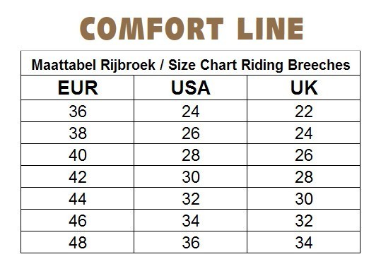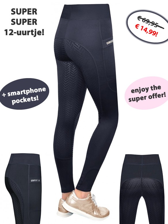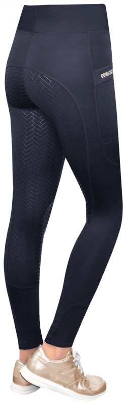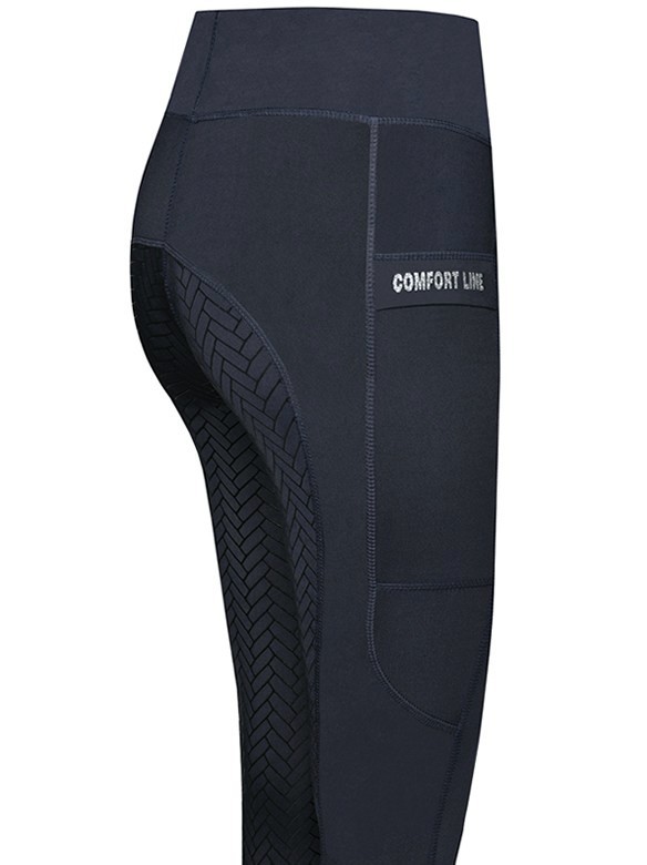 Zeer comfortabele en trendy tights rijbroek met anti-slip zit. De elastische stof is zeer vochtregulerend, ademend, sneldrogend en daardoor comfortabel in het dragen. De anti-slip zit is stroef en flexibel en zorgt voor extra grip en dus een stabielere zit tijdens het rijden. Aan beide zijkanten heeft de rijbroek een praktisch zakje voor bijvoorbeeld de smartphone en op het rechter zakje bevindt zich een glinsterend Comfort Line-logo. De Stretch-beensluiting past optimaal om de enkel en garandeert het best mogelijke draagcomfort in rijlaarzen. Vervaardigd van 88% micropolyester en 12% spandex. Machinewasbaar. Verkrijgbaar in de kleur navy.