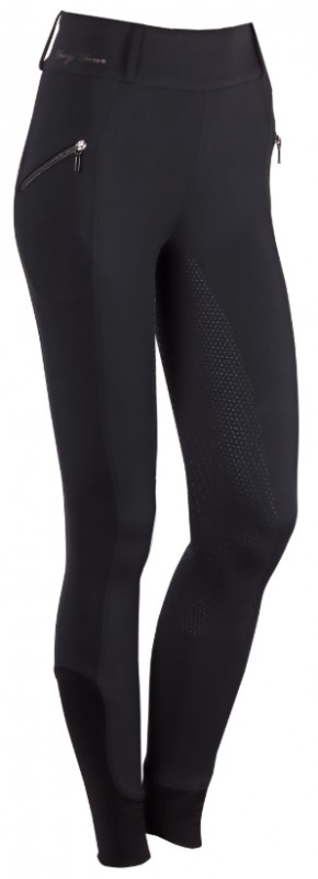 Trendy tights rijbroek met anti-slip zit en Stretch-beensluiting. De anti-slip zit is extra stroef en flexibel en zorgt voor extra grip en dus een stabielere zit tijdens het rijden. De EquiTights heeft een brede, elastische tailleband zonder voorsluiting. Hierdoor kan de rijbroek goed aansluiten en het zorgt voor meer bewegingsvrijheid en comfort aan de voorkant. Aan de zijkanten is de rijbroek voorzien van een zakje met rits voor bijvoorbeeld uw smartphone. Boven het linker zakje bevindt zich een Harry's Horse-logo. De Stretch-beensluiting past optimaal aan de enkel en garandeert het best mogelijke draagcomfort in rijlaarzen. Vervaardigd van 60% nylon en 40% elasthan. Machinewasbaar. Verkrijgbaar in de kleur black.
