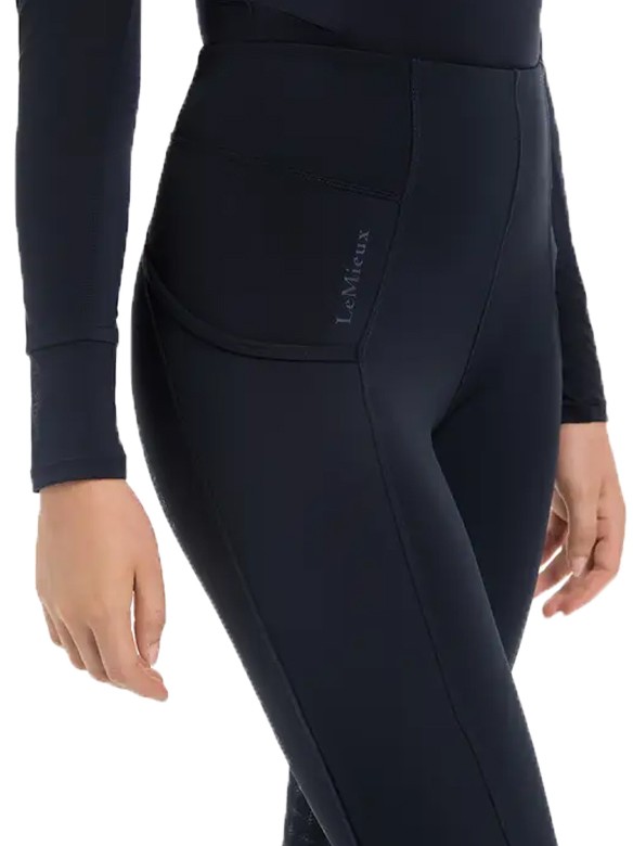 Comfortabele pull-on rijbroek met een brede, elastische tailleband zonder voorsluiting. Hierdoor kan de rijbroek goed aansluiten en het zorgt aan de voorkant voor meer bewegingsvrijheid en comfort. De rijbroek is voorzien van een elastische anti-slip zit. De anti-slip zit is extra stroef en flexibel en zorgt voor extra grip en dus een stabielere zit tijdens het rijden. Op beide benen bevindt zich een zakje voor bijvoorbeeld uw smartphone. Op het rechterbeen en aan de achterkant op de band heeft de rijbroek een subtiel LeMieux-logo. Vervaardigd van 70% polyester en 30% elasthan. Hoog model. Machinewasbaar. Verkrijgbaar in de kleur navy.