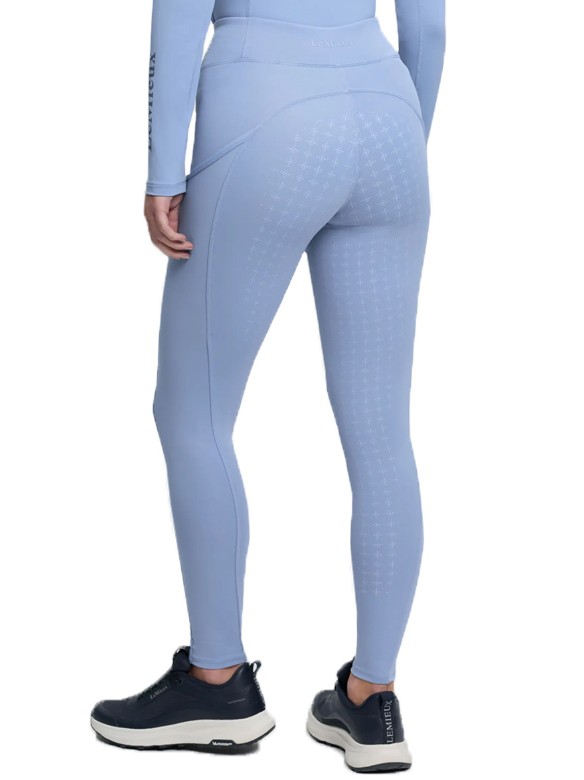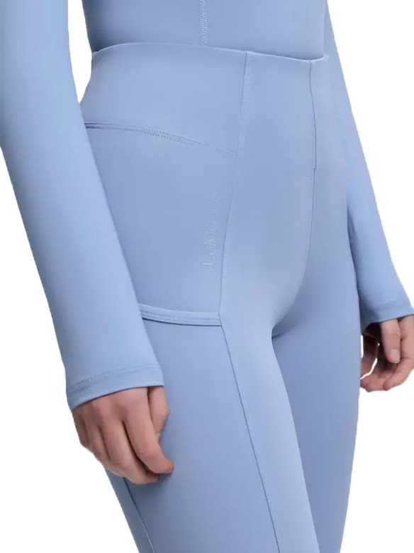 Comfortabele pull-on rijbroek met een brede, elastische tailleband zonder voorsluiting. Hierdoor kan de rijbroek goed aansluiten en het zorgt aan de voorkant voor meer bewegingsvrijheid en comfort. De rijbroek is voorzien van een elastische anti-slip zit. De anti-slip zit is extra stroef en flexibel en zorgt voor extra grip en dus een stabielere zit tijdens het rijden. Op beide benen bevindt zich een zakje voor bijvoorbeeld uw smartphone. Op het rechterbeen en aan de achterkant op de band heeft de rijbroek een subtiel LeMieux-logo. Vervaardigd van 70% polyester en 30% elasthan. Hoog model. Machinewasbaar. Verkrijgbaar in de kleur powder blue.