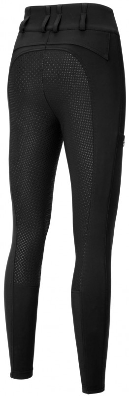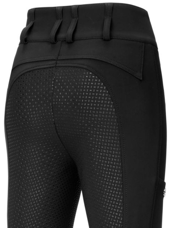 Chique model rijbroek met hoge band, elastische anti-slip zit en Stretch-beenafsluiting. De DuraGrip anti-slip zit is extra stroef en flexibel en zorgt voor extra grip en dus een stabielere zit tijdens het rijden. De voorsluiting is voorzien van drie schuifknoopjes. De rijbroek heeft aan de voorkant jeans-pockets en een een praktisch zakje voor bijvoorbeeld uw smartphone op het rechter bovenbeen. Het zakje voor de smartphone is voorzien van een Pikeur-logo. De grote riemlussen maken deze broek extra trendy. De Stretch-beensluiting past optimaal om de enkel en garandeert het best mogelijke draagcomfort in de rijlaarzen. Vervaardigd van 75% polyamide en 25% elasthan. Machinewasbaar. Verkrijgbaar in de kleur black.