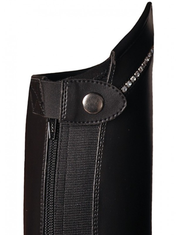 Trendy mini-chaps van kunstleder met een ritssluiting aan de achterkant die van beneden naar boven loopt. Langs de rits heeft de Comet een elastische inzet die ongeveer 1,5 tot 2 centimeter meerekt. De Comet heeft een extra hoge dressuurboog van 6 cm die stijlvol is afgewerkt met zilverkleurige strass-steentjes. Aan de bovenkant heeft de ritssluiting een ritsbeschermer met drukknoopsluiting. De Comet heeft een elastische band aan de onderkant die om de rijschoen gaat. Eenvoudig schoon te maken met een vochtige doek. Per paar verpakt. Verkrijgbaar in de kleur black.