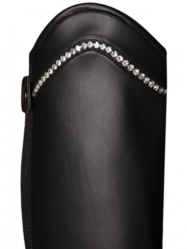 Trendy mini-chaps van kunstleder met een ritssluiting aan de achterkant die van beneden naar boven loopt. Langs de rits heeft de Comet een elastische inzet die ongeveer 1,5 tot 2 centimeter meerekt. De Comet heeft een extra hoge dressuurboog van 6 cm die stijlvol is afgewerkt met zilverkleurige strass-steentjes. Aan de bovenkant heeft de ritssluiting een ritsbeschermer met drukknoopsluiting. De Comet heeft een elastische band aan de onderkant die om de rijschoen gaat. Eenvoudig schoon te maken met een vochtige doek. Per paar verpakt. Verkrijgbaar in de kleur black.
