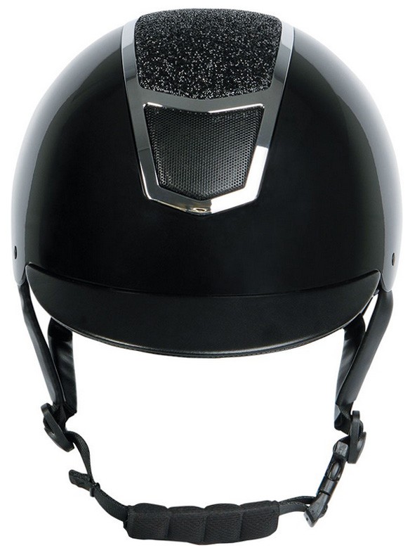 Lichtgewicht rijhelm met een stijlvolle, glinsterende baan in het midden. Dit zorgt voor een elegante uitstraling. Aan de voor- en achterkant van deze baan heeft de rijhelm ventilatiegaatjes, welke verkoeling bieden tijdens het rijden. De rijhelm voldoet aan de Europese norm EN 1384:2023, wat wil zeggen dat de rijhelm voldoet aan de veiligheidseisen. De hoofdring van de rijhelm is verstelbaar met een draaischijf zodat de helm voor iedereen passend gemaakt kan worden. De rijhelm is voorzien van een gevoerde kinband en meerdere ventilatiesleuven. De ventilatiesleuven zijn afgewerkt met een baan in de kleur silver. De binnenvoering is uitneembaar en machinewasbaar. Verkrijgbaar in de kleur black/silver met black sparkle.