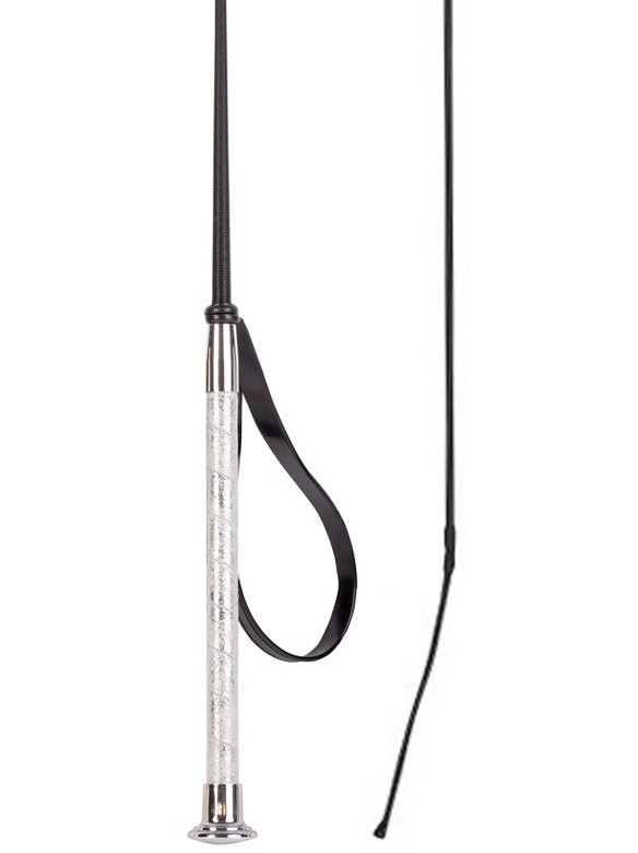 Trendy riding whip with wrist strap, shiny, imitation leather handle. The whip has a nylon lash and a gun metal coloured knob. The wrist strap is easily detachable if you wish to use the whip without it. Available in the colour mistletoe.