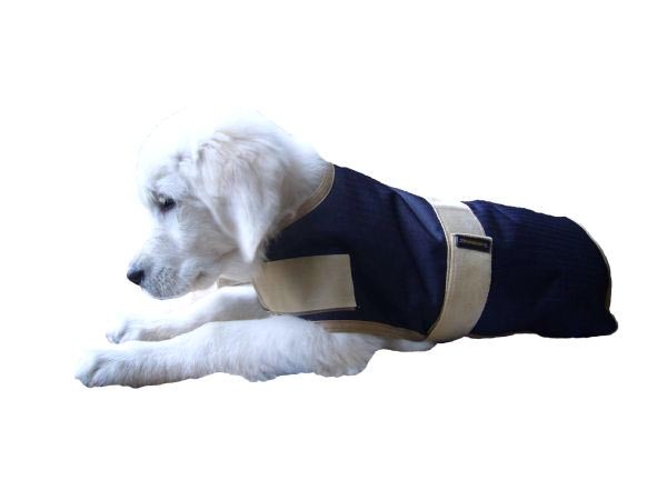 Waterdichte hondendeken met 200 grams vulling voor extra warmte. De hondendeken is heeft een verstelbare voorsluiting en een buiksluiting d.m.v. klittenband. Voor een stabiele ligging voorzien van elastische en soepele bilkoordjes voor om de achterbenen. De deken is sterk, ademend, winddicht en gevoerd met zachte katoen. Machinewasbaar op 30 graden. Verkrijgbaar in de kleur navy met beige bies en sluiting.