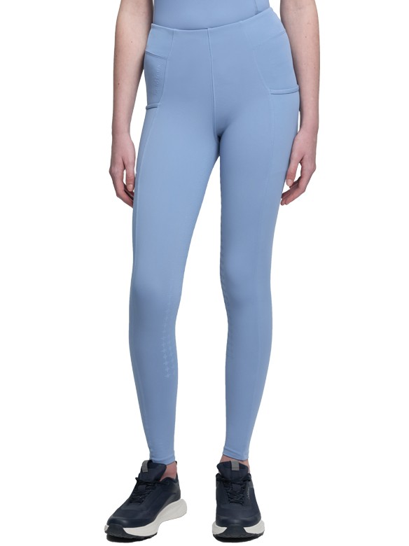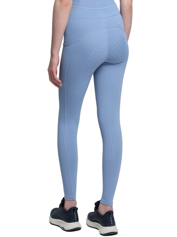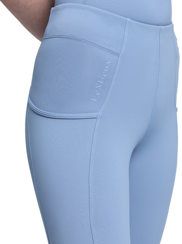 Trendy tights voor de jeugd met een brede, elastische tailleband zonder voorsluiting. Hierdoor kan de rijbroek goed aansluiten en het zorgt aan de voorkant voor meer bewegingsvrijheid en comfort. De rijbroek is voorzien van een elastische anti-slip zit. De anti-slip zit is extra stroef en flexibel en zorgt voor extra grip en dus een stabielere zit tijdens het rijden. Op beide benen bevindt zich een zakje voor bijvoorbeeld de smartphone. Boven het rechter zakje en aan de achterkant op de tailleband bevindt zich een LeMieux-logo. Vervaardigd van 70% polyester en 30% elasthan. Hoog model. Machinewasbaar. Verkrijgbaar in de kleur powder blue.