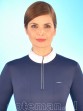 The Baika is a stylish competition shirt with long sleeves and it's made of a high-quality technical fabric from Italy. The material is moisture wicking, very elastic and dirt repellent. The cotton collar for stock tie has a short, blind zip closure at the front. The collar for stock tie is finished all around with silver coloured Swarovski and along the zipper are also silver coloured Swarovski stones. Because of this, the Baika looks also great without wearing a stock tie. Furthermore, the competition shirt has a Swarovski Animo logo on the left chest. Made of 90% polyamide and 10% elastane. Made in Italy. Machine washable on 30 degrees wool wash program. Available in the colour ombra.