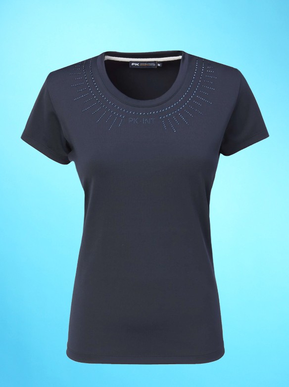 Trendy shirt for kids with short sleeves and round neck. The shirt has many sparkling crystals. There is a glittering PK logo of strass stones on the front and at the back under the collar. The Rando is elastic, moisture wicking, breathable, quick-drying and cooling. Made of 90% polyamide and 10% elastane. Fitted model. Machine washable. Available in the colour moonlight.