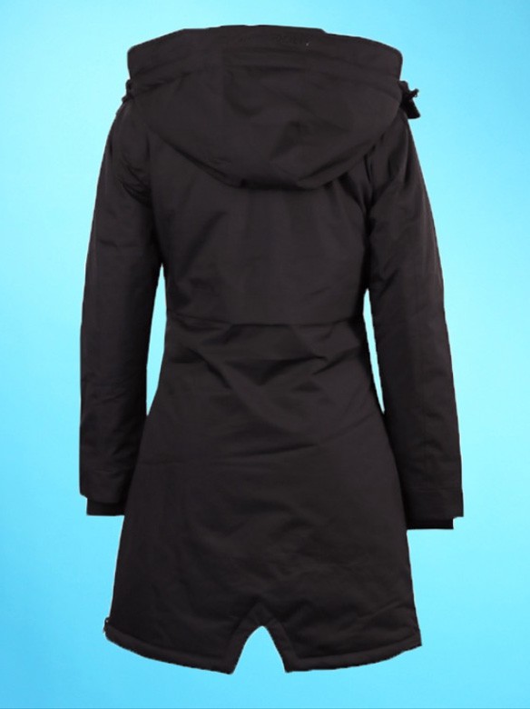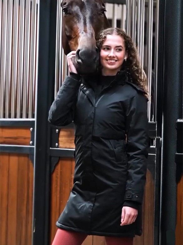 Comfortable, waterproof parka with a hood. On the front, the parka has a two-way zipper with flap and press buttons. The parka is fitted with two pockets with press button closure and an inside pocket with a headphone cord opening. On the sides, the parka has a riding splits with a waterproof zipper for extra freedom of movement. The riding splits are also lined. This makes the parka waterproof and suitable for riding. Fitted model. Made of 100% polyester. Machine washable. Available in the colour jet black.