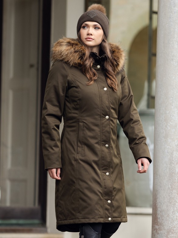 Comfortable wind and waterproof parka in a long model. The parka is equipped with a detachable hood with a detachable imitation fur trim and fleece lining. The hood is fitted with elastic drawcords. The parka has two pockets with zipper, an inside pocket with zipper and a two-way zipper with flap on the front. The flap is fitted with press buttons. Furthermore, the parka has inserts of fleece on the inside and drawcords at the waist. On the inside, the parka also has elastic and adjustable straps to tighten around the legs and prevent the parka from going up in the wind. There is a riding split with press buttons and magnets on the back for extra freedom of movement. Fitted with a LeMieux logo on the left sleeve and below the hood. Fitted model. Made of 56% polyamide and 44% polyester. Machine washable. Available in the colour alpine.