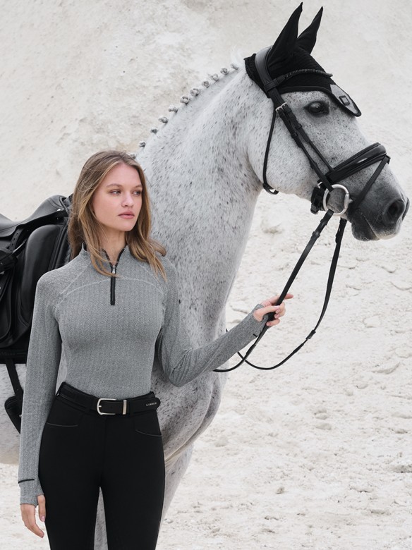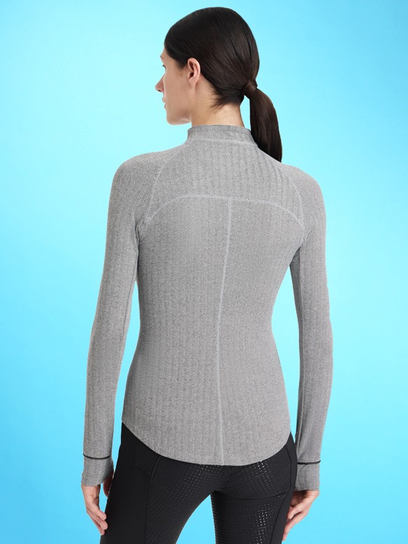 Stijlvol, elastisch shirt met korte ritssluiting en lange mouwen. Het shirt is elastisch, vochtregulerend, ademend en comfortabel. Het herringbone motief en het LeMieux-logo op de linkermouw maken het shirt extra stijlvol. De mouwen zijn voorzien van duimgaten die u kunt gebruiken om uw handen warm te houden. Vervaardigd van 77% nylon, 15% polyester en 8% elasthan. Machinewasbaar. Verkrijgbaar in de kleur black.