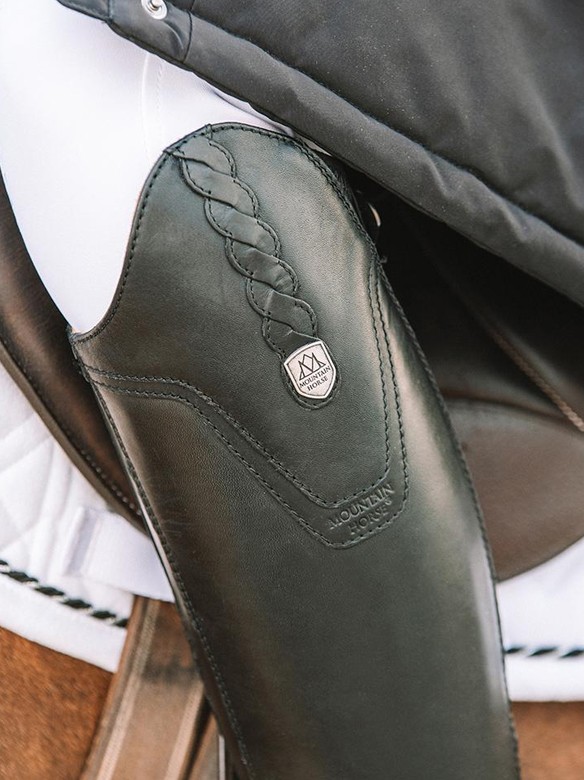 Elegant, supple leather riding boot with elastic laces on the instep. The riding boot has a high dressage arch and is slim around the ankles. The zipper and elastic insert at the back give this riding boot a perfect fit. The zipper extends all the way to the sole. The comfortable and shock-absorbing Vertycore footbed makes this riding boot not only suitable for riding but also for everyday wear during work in and around the stable. The zipper has a flap at the top and bottom with a snap closure. The Mountain Horse Valkyria has a leather lining and a durable outsole with optimal grip. A stylish and subtle Mountain Horse logo is featured on the dressage arch. Made of supple full-grain cow leather. Available in the colour black.