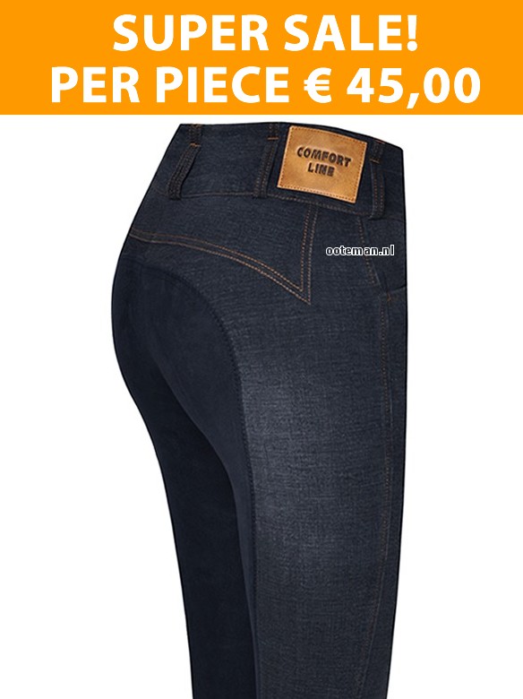 Chic model riding breeches with optical high band, elastic McCrown seat and Stretch leg closure. The front closure is provided with three slide buttons. The large belt loops make these riding breeches extra trendy. With Comfort Line logo at the left pocket and a Comfort Line badge on the waistband. The riding breeches fit just over the hip. The Stretch leg closure fits perfectly around the ankle, ensuring the best possible comfort in riding boots. Made of 77% cotton, 15% polyester and 8% spandex and therefore comfortable in all seasons. Machine washable. Available in the colour navy.