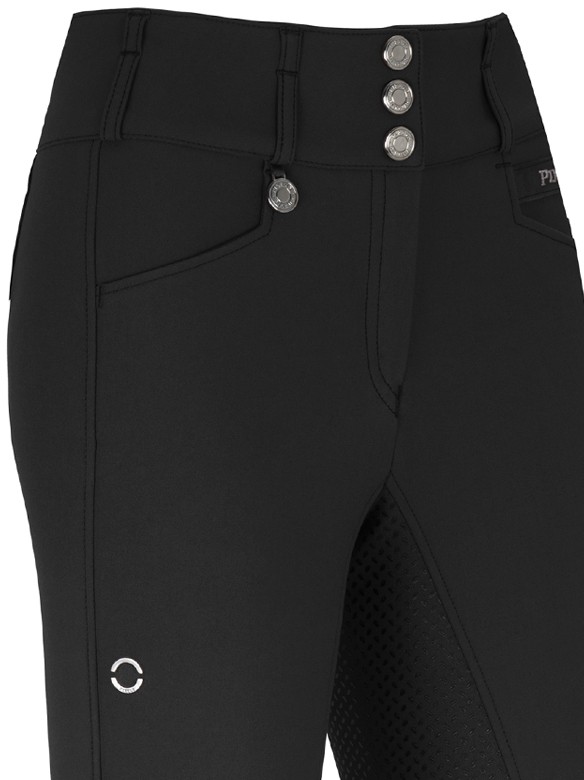 Stylish riding breeches with a high waistband, elastic anti-slip seat and Stretch leg closure. The well-known MicroCotton fabric is comfortable to wear and fits neatly. The anti-slip seat is extra stiff and flexible and provides extra grip and therefore a more stable sit while riding. The front closure has three slide buttons. The riding breeches have jeans pockets at the front and a luxurious Pikeur logo on the right thigh. The large belt loops create an extra trendy look. The Stretch leg closure fits optimally around the ankle and guarantees the best possible wearing comfort in the riding boots. Made of MicroCotton 64% cotton, 29% polyamide and 7% elastane. Machine washable. Available in the colour black.