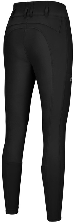 Chique model riding breeches with high waistband, elastic anti-slip seat and Stretch leg closure. The anti-slip seat is extra stiff and flexible and provides extra grip and therefore a more stable sit while riding. The front closure is provided with three slide buttons. The riding breeches have jeans pockets at the front and a pocket for, for example, a smartphone on the right leg. The pocket for the smartphone is finished eith a Pikeur logo. The large belt loops make these riding breeches extra trendy. The Stretch leg closure fits perfectly around the ankle, ensuring the best possible comfort in riding boots. Made of 75% polyamide and 25% elasthan. Machine washable. Available in the colour black.