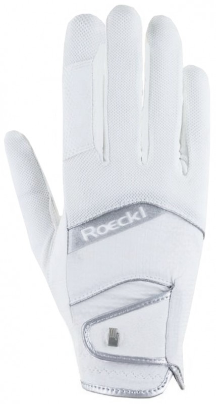 Very comfortable and light riding gloves by Roeckl with back panel of micro-mesh. The elastic back, made of Lycra, ensures a perfect fit and feels cooling. On the back is a subtle glittering Roeckl logo. The anti-slip imitation leather in the palm of the hand provides optimum grip and is touchscreen compatible. Equipped with velcro closure with Roeckl logo. Packed per pair. Machine washable (30°C). Available in the colour white. (310027-1000)
