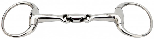 Eggbutt with link, made of stainless steel. Basic bit, especially suitable for ponies without bit problems and young ponies. The bit has rings with a diameter of 45 mm. The thickness of the bit is 18 mm. Available in stainless steel. (180425)