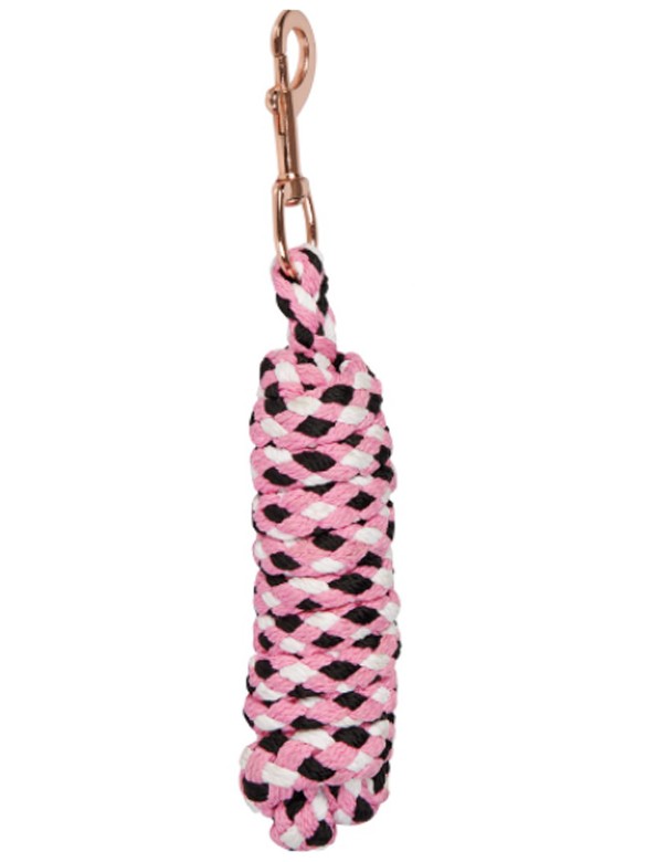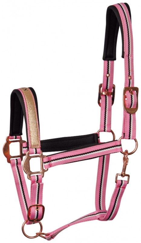 Trendy headcollar made of polyester with contrasting stripes and adjustable noseband. There is a glittering lane on the nose with the text 'Queen'. The throat strap has a clip and the headpiece is adjustable on one side by means of a buckle. Available in the colour pink.