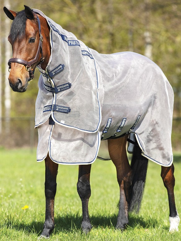 Sturdy fly rug with a detachable neck and 65% UV-protection. The fly rug is made of soft, strong, comfortable and patented polyester. This material offers your horse, together with the large belly flap with three surcingles and the extra large tail flap, optimal protection against flies and other insects. The rug is also breathable and moisture wicking, which prevents overheating. The neck is detachable by means of velcro fasteners. The rug has arches for the forelegs and a V-chest closure with two snaps with a ring for extra freedom of movement. In addition, the rug has a soft lining at the shoulders and neck to prevent chafing. The three surcingles and the leg strap ensure that the rug stays in a good position. Available in the colour silver with binding in the colour navy/white/beige. (AFAR90-IBWT)