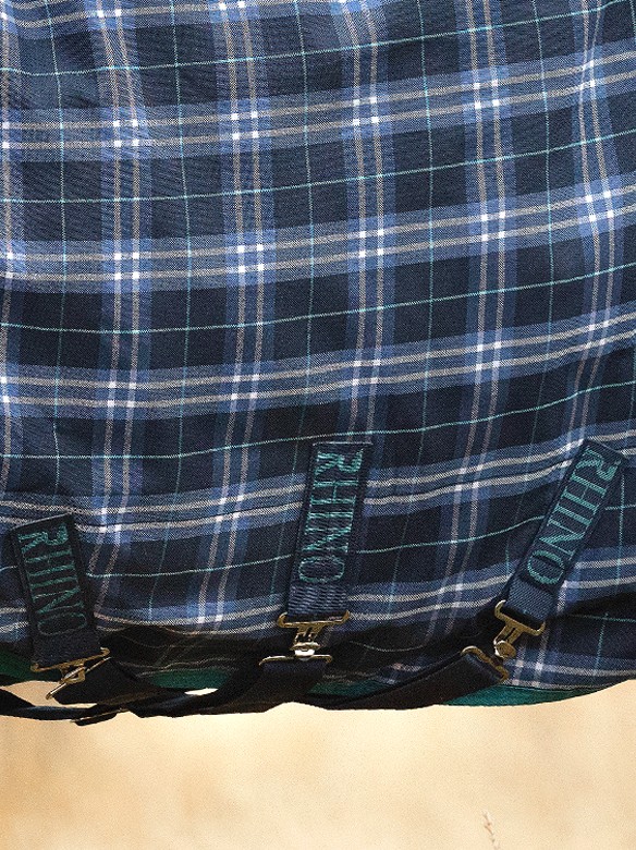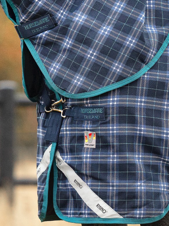 Water- and windproof turnout rug with 250 grams filling and with a detachable neck piece. The turnout rug is made of strong 1000 Denier polypropylene and is lined with smooth nylon. The outer fabric is extra strong, durable and has an extra breathable layer to keep your horse dry. The anti-bacterial inside is smooth, preventing the fur from damaging. The special thermo-fibre filling has very good insulating properties and is lightweight. The turnout rug is made according to the Vari-layer concept, meaning that the back part has a 250-grams thermo-fibre filling and the sides a 100-grams filling. Because of this, the rug is lightweight and nicely warm while also being very comfortable for your horse. The front closure is equipped with a V-front closure to ensure a good fit. The Rhino Plus has three cross surcingles, a tail flap, reflecting details and an elastic leg strap with smooth outer fabric made of PVC for easy cleaning. Because of the good fit and the cut-outs for the legs, the rug will remain in the right position, providing your horse with a lot of freedom of movement. The turnout rug has rings to attach a Horseware Under Rug Liner to. Ideal rug for in the meadow or in the stable. Machine washable. Available in the colour navy check with piping in the colour teal. (AABPV3-C3D0)