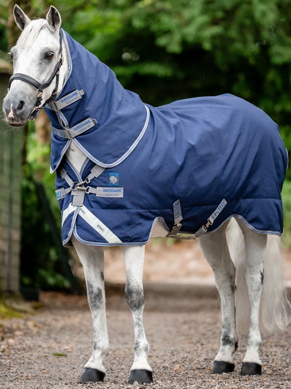 Water- and windproof turnout rug with 250 grams filling and with a detachable neck piece. The turnout rug is made of strong 1000 Denier polypropylene and is lined with smooth nylon. The outer fabric is extra strong, durable and has an extra breathable layer to keep your horse dry. The anti-bacterial inside is smooth, preventing the fur from damaging. The special thermo-fibre filling has very good insulating properties and is lightweight. The turnout rug is made according to the Vari-layer concept, meaning that the back part has a 250-grams thermo-fibre filling and the sides a 100-grams filling. Because of this, the rug is lightweight and nicely warm while also being very comfortable for your horse. The front closure is equipped with a V-front closure to ensure a good fit. The Rhino Plus has three cross surcingles, a tail flap, reflecting details and an elastic leg strap with smooth outer fabric made of PVC for easy cleaning. Because of the good fit and the cut-outs for the legs, the rug will remain in the right position, providing your horse with a lot of freedom of movement. The turnout rug has rings to attach a Horseware Under Rug Liner to. Ideal rug for in the meadow or in the stable. Machine washable. Available in the colour navy with piping in the colour titanium grey/classic blue. (AKBP92-BJD0)