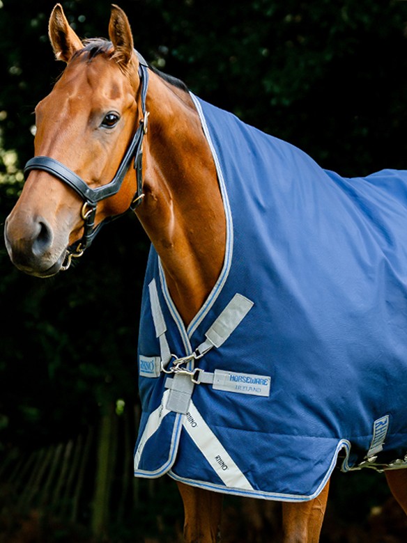 Water- and windproof outdoor rug with 450-grams filling and a half neck. The outdoor rug is made of strong 1000 Denier polypropylene. The outer fabric is extra strong, durable and has an extra breathable layer to keep your horse dry. The anti-bacterial inside is smooth, preventing the fur from damaging. The special thermo-fibre filling has very good insulating properties and is lightweight. The outdoor rug is made according to the Vari-layer concept, meaning that the back part has a 450-grams thermo-fibre filling, the sides a 300-grams filling and the bottom a 150-grams filling. Because of this, the rug is lightweight and nicely warm while also being very comfortable for your horse. The Rhino Wug Heavy is fitted with a V-chest closure with two snap closures and a ring for extra freedom of movement. Furthermore, the rug has a tail flap, three cross surcingles, reflective details and a leg strap. Because of the half neck, good fit and the cut-outs for the legs, the rug will remain in the right position, providing your horse with a lot of freedom of movement. Ideal rug for in the meadow or in the stable. Machine washable. Available in the colour navy with piping in the colour titanium & classic blue. (AABWV4-BJD0)