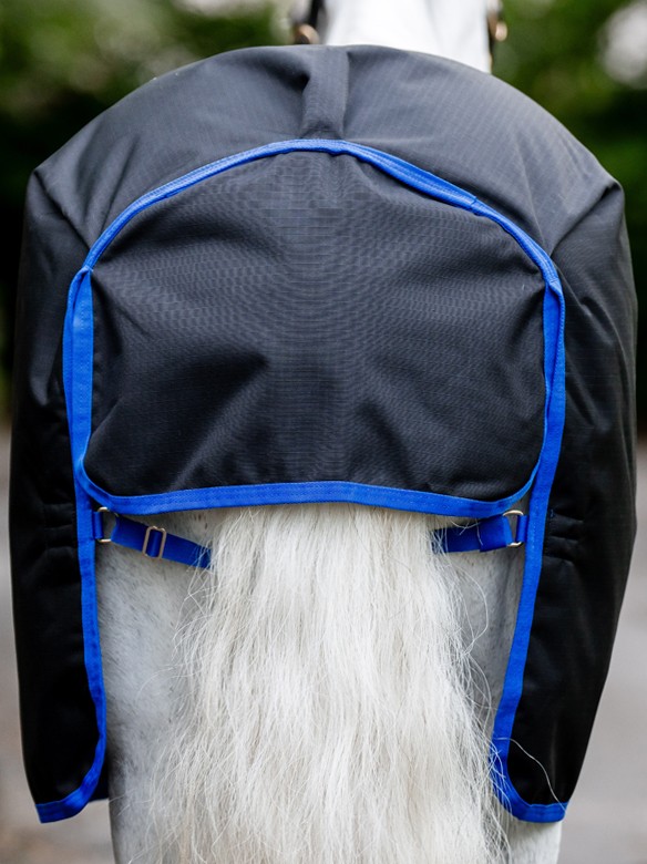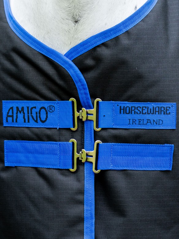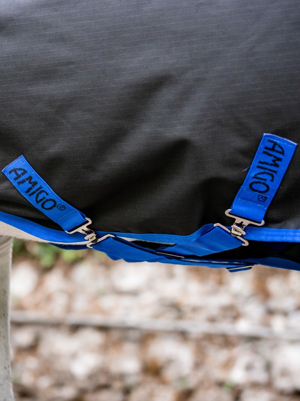 Water- and windproof turnout rug with 50 grams fililng. The turnout rug is made of 900 Denier ripstop-polyester and has a lining of smooth nylon for a shiny fur. The Amigo 900 is also fitted with a double chest closure, tail flap, two cross surcingles, rings for legstraps and a single leg strap. Because of the good fit and the cut-outs for the legs, the rug will remain in the right position, providing your horse with a lot of freedom of movement. The turnout rug has rings to attach a Horseware Under Rug Liner and a neck piece to. Machine washable. Available in the colour black with piping in the colour classic blue. (AARAG1-KDD0)