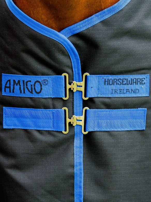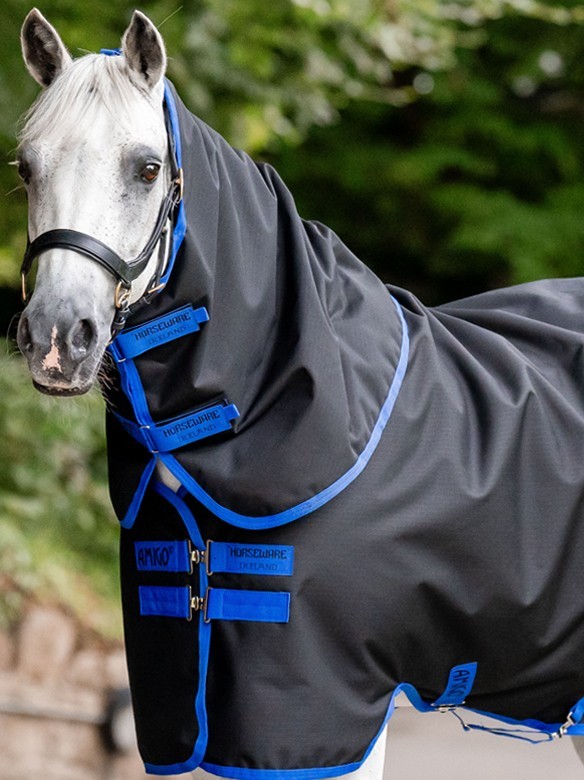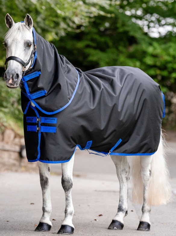 Water- and windproof turnout rug for ponies with 100-grams filling and with detachable neck piece. The turnout rug is made of 900 Denier polyester and has a lining of smooth nylon for a shiny fur. The Amigo 900 is also fitted with a double chest closure, tail flap, two cross surcingles, rings for legstraps and a leg strap. Because of the good fit and the cut-outs for the legs, the rug will remain in the right position, providing your horse with a lot of freedom of movement. The turnout rug has rings to attach a Horseware Under Rug Liner. Machine washable. Available in the colour black with piping in the colour classic blue. (AARQG2-KDD0)