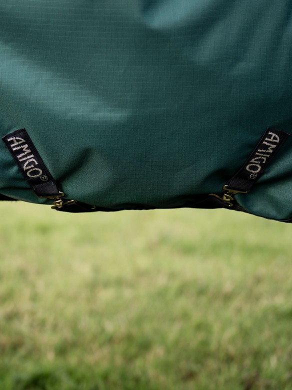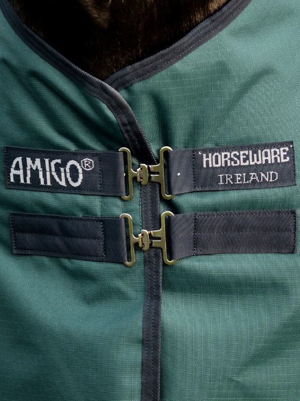 Water- and windproof turnout rug for ponies with 100-grams filling and with detachable neck piece. The turnout rug is made of 900 Denier polyester and has a lining of smooth nylon for a shiny fur. The Amigo 900 is also fitted with a double chest closure, tail flap, two cross surcingles, rings for legstraps and a leg strap. Because of the good fit and the cut-outs for the legs, the rug will remain in the right position, providing your horse with a lot of freedom of movement. The turnout rug has rings to attach a Horseware Under Rug Liner. Machine washable. Available in the colour dynasty green with piping in the colour navy/silver. (AARQG2-GBI0)