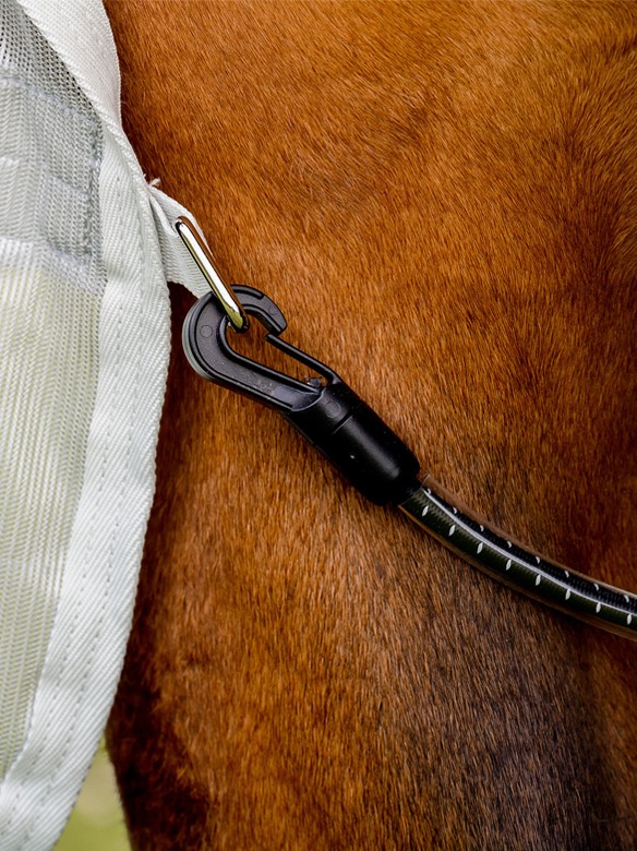 Lightweight fly rug for in the summer with a detachable neck and 100% UV-protection on the back. The part on the back is made of waterproof 1200 Denier polyester with a smooth nylon lining, keeping the back of your horse dry. The rug is made of fine mesh, has sun reflective properties and is therefore breathable and cooling. The detachable neck has a double velcro closure and an insert of mesh at the bottom. On the chest, the rug is fitted with the Disc Closure System. This ergonomically shaped closure system ensures for a lot of freedom of movement for the shoulders and neck. Furthermore, the rug has an extra-large waterproof tail flap, a belly flap with three surcingles and an elastic leg strap with smooth outer fabric made of PVC for easy cleaning. Because of the good fit and double cut-outs at the legs, the rug stays in the right position and your horse has a lot of freedom of movement. Ideal rug for in the meadow during (rainy) summer days. Machine washable. Available in the colour teal/grey. (AFRPLE-CTJ0)