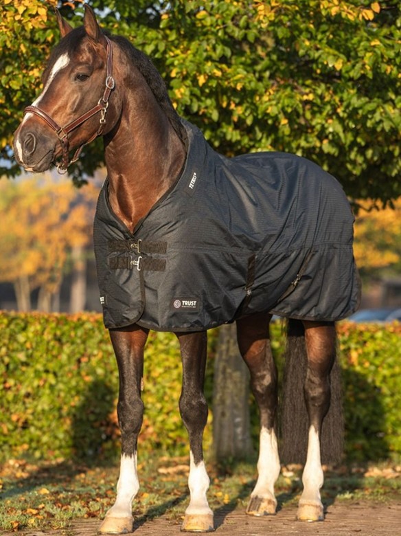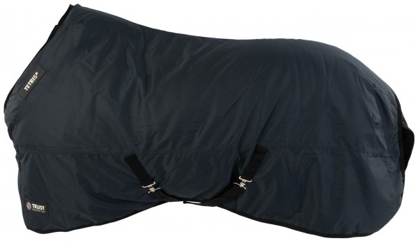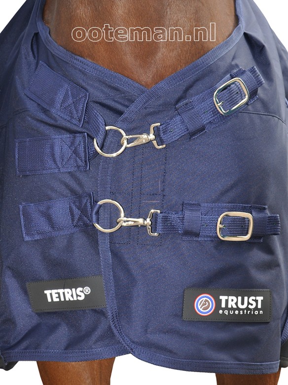 Waterdichte, 300 grams regendeken met het Tetris-systeem. Het Tetris-systeem bestaat uit zachte blokken bij de schoft. Deze blokken vormen een soort tunnel waardoor de deken rondom de schoft geheel vrij en stabiel ligt. Hierdoor worden schuurplekken voorkomen. De deken is gemaakt van 600 Denier ademend polyester en is aan de binnenkant met glad nylon gevoerd. Voorzien van twee metalen borstsluitingen, een staartflap en bilkoorden. De kruissingels bevinden zich aan de binnenkant. Door de elastische inzetten van neopreen heeft uw paard veel bewegingsvrijheid en zijn loopsplitten overbodig geworden. Ideale deken voor in de wei of op stal. Machinewasbaar. Verkrijgbaar in de kleur navy.