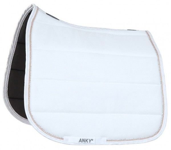 Luxury saddle pad with an outer fabric of 3D-mesh. Because of the 3D-mesh, the saddle pad is quick drying, lightweight and ventilating. The saddle pad is fitted with rosegold coloured piping and there is a row of silver coloured strass stones along the cord piping. The saddle pad also has trim of suedine, fitted with silver coloured dessin. Furthermore, the saddle pad has a moisture wicking Cool Plus lining and a filling of 430 grams poly padding. There is a loop for the girth with velcro closure at the bottom and as well as an Anky logo. Machine washable. Available in the colour white.