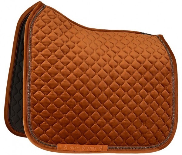 Beautiful quality, anatomically shaped saddle pad lined with moisture wicking. The saddle pad is made of velvet which makes a stylish look and has a double cord piping with grey coloured strass stones. At the bottom there is a loop for the girth for a stable position. Features an Anky logo on the leftside. Machine washable. Available in the colour rust.