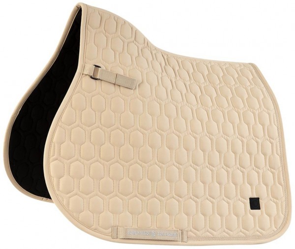 Summery, thin and anatomically shaped saddle pad with moisture wicking Cool Plus lining. The outer fabric is quilted. The saddle pad has a braided piping and a BR logo on both sides. The detachable saddle loop has a velcro closure and at the bottom there is a girth loop with velcro closure. Machine washable. Available in the colour safari.
