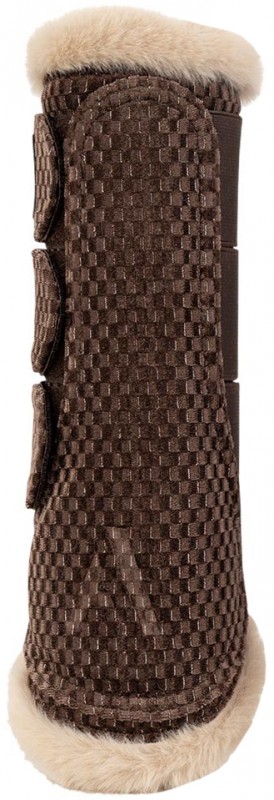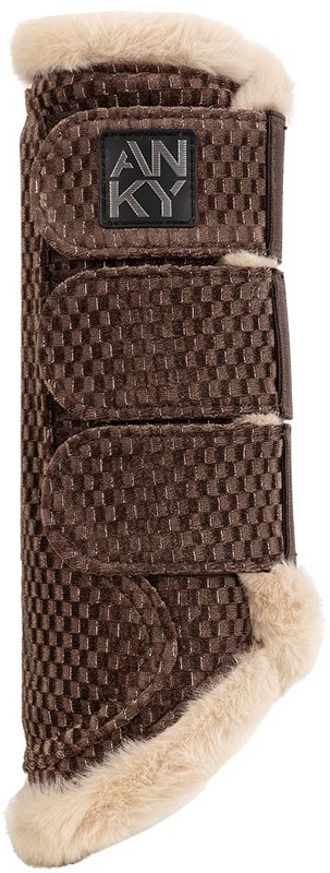Luxe beenbeschermers van velvet voor de voor- en achterbenen. De beenbeschermer heeft een goed ventilerende voering van schokabsorberend en geperforeerd neopreen. De rand van imitatie-bont is extra zacht en de klittenbandsluitingen zijn afgewerkt met elastiek. Met Anky-logo op de klittenbandsluiting. Per paar verpakt. Machinewasbaar. Verkrijgbaar in de kleur deep taupe.