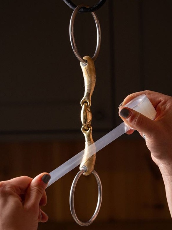 Kan bijdragen aan een betere acceptatie van het bit! Transparante, elastische tape voor een zacht gevoel van het bit in de paardenmond, óók voor gevoelige paarden. Tevens vermindert de tape knellen van het bit en repareert het beschadigingen aan het mondstuk door kauwen. De siliconen tape is eenvoudig om een schoon bit te wikkelen. Door stevig aan de tape te trekken worden de zelfklevende eigenschappen geactiveerd. Werk van de buitenste uiteinden van het mondstuk naar het midden en weer naar buiten, totdat de gewenste dikte is bereikt. Verwijder en vervang de tape eenvoudig als er tekenen van slijtage zichtbaar worden. De bit wrapping tape is latex vrij en heeft een lengte van 300 cm lengte en een breedte van is 2,54 cm. Verkrijgbaar in de kleur transparant.