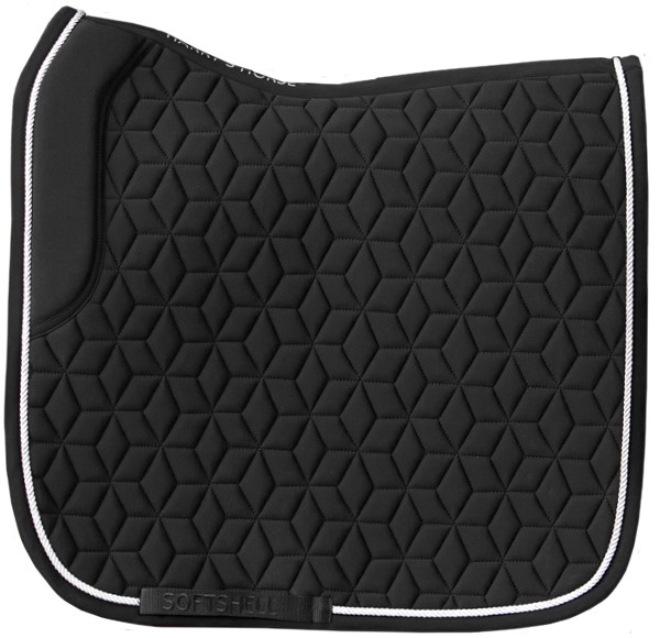 Trendy zadeldek van Harry's Horse met een silver-kleurige koordbies. Het zadeldek heeft een buitenstof van softshell en aan de binnenkant is het zadeldek voorzien van een sneldrogende en ademende voering van mesh. Aan de voorkant bevindt zich een subtiele, licht verhoogde inzet met een zachte vulling van foam voor extra stabiliteit en ondersteuning van het zadel. Aan de onderkant bevindt zich een singellus. Verder is het zadeldek voorzien van een Harry's Horse-logo op de bovenkant. Machinewasbaar. Verkrijgbaar in de kleur black.