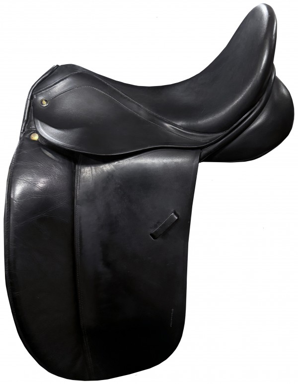 Gebruikt dressuurzadel van BR met een 17" zitgrootte en een licht aanpasbare, medium boom. De diepe, zachte zit en de grote verplaatsbare beensteunen zorgen voor een optimale, stevige beenligging en een vaste zit. Aan de linkerkant heeft deze BR Mozart twee nieuwe singelstoten. De achterste singelstoot is bevestigd aan een V-systeem en de voorste is een halve voorsingel, die ook aangepast kan worden naar een hele voorsingel. Verder heeft het zadel zachte, wolgevulde kussens. Vervaardigd van soepel leder. Verkrijgbaar in de kleur black.