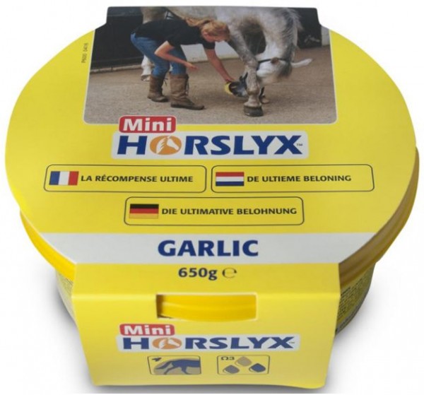 Lik beloning voor paarden, pony's en enzels met gezonde knoflook. Mini Horslyx is een welkome afleiding bij knippen, scheren, vangen, laden, voor rek- en strekoefeningen, tijdens bezoek van de veearts of hoefsmid of gewoon als lekkere beloning.