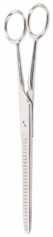 Schaar voor het pijnloos uitdunnen van de staart en manen. De schaar heeft aan beide zijden kartels, waardoor de manen met iedere knip iets worden uitgedund. Verkrijgbaar in roestvrijstaal.